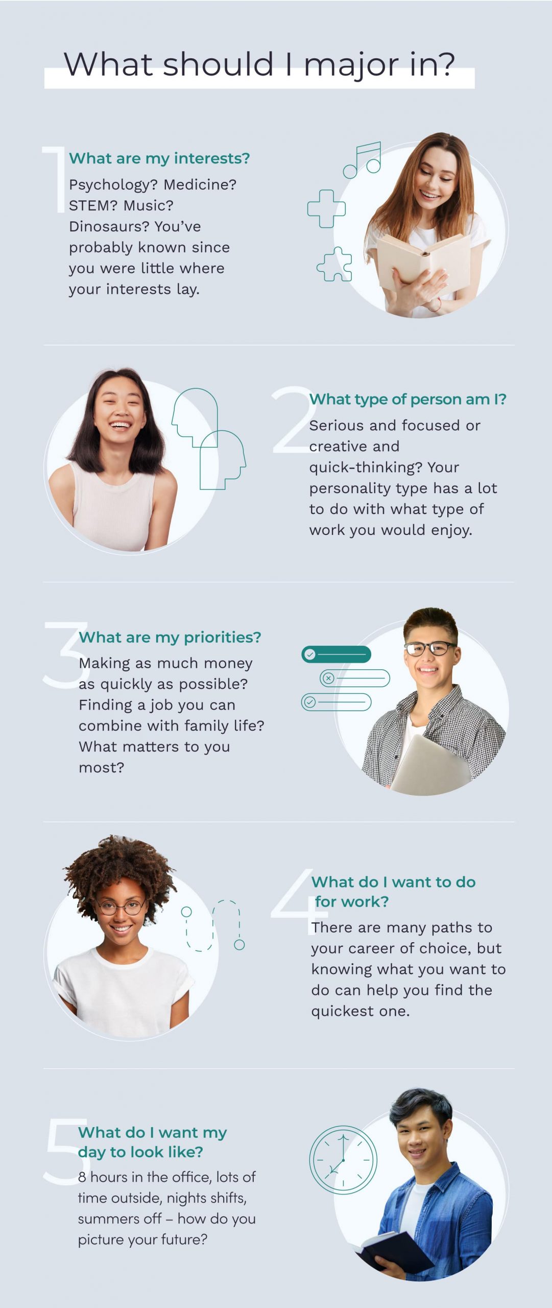 The process of reviewing and selecting the best majors in college doesn’t have to be stressful. In fact, it can be an exciting experience that allows you to reflect on what matters most to you. Below, we offer suggestions on essential points to consider in answering the question ‘What should I study in college?’.